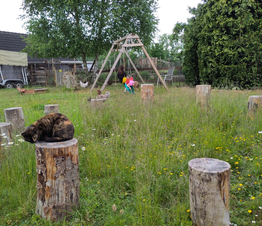 Es gibt einen großen Garten mit Spielplatz und Trampolin.