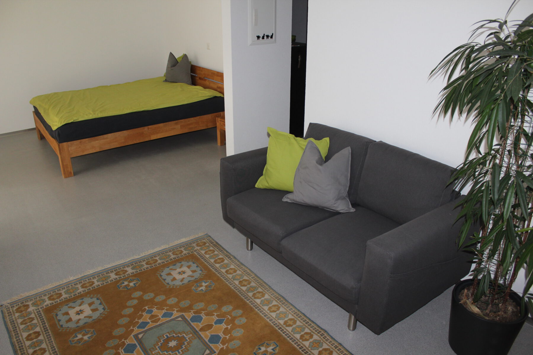 Wohnbereich (Tisch, Sofa, Doppelbett)