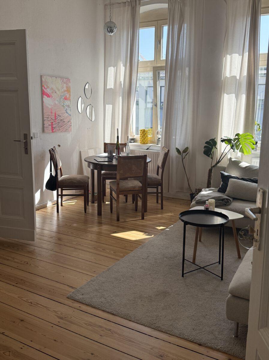 Voll möbliert, ruhig im Hinterhof, 4. Stock (ohne Aufzug), sehr hell mit Sonne am Mittag. Altbau mit Charme – hohe Decken, Holzdielen, moderne Einrichtung.